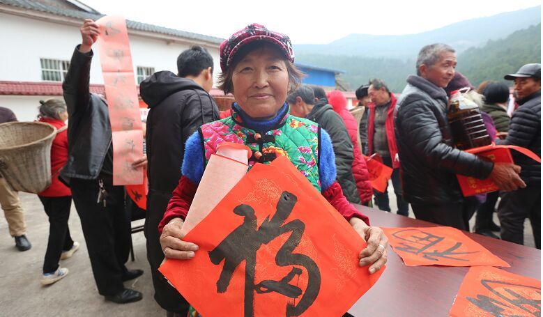 会员一行在学校驻村第一书记的配合下,很快投入现场书写春联、福字和剪纸中,短短4个小时,书写春联100余副、福字80张和剪纸60余张。中午时分,村民陆续来到现场,选春联,求福字,领纸花,近200平米的村委会院坝内人声鼎沸,好生热闹,村民的脸上露出了开心的笑容。一位老奶奶不停地问:“这些人是哪来的吗?”年轻人不厌其烦地给她讲:“他们是帮扶我们村的那个学校川北幼专的老师,是民进的同志!”老奶奶一手拿着春联,一手挥着福字和纸花,口里念念有词:共产党好!川北幼专好!民进好!