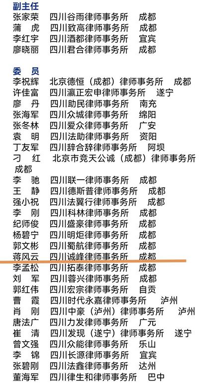 近日,四川省律师协会发布了第十四届四川省律师协会专门委员会委员名单,经过严格选拔,民进成都市金堂县总支委员、四川诚峰律师事务所主任蒋风云当选参政议政专门委员会委员。
