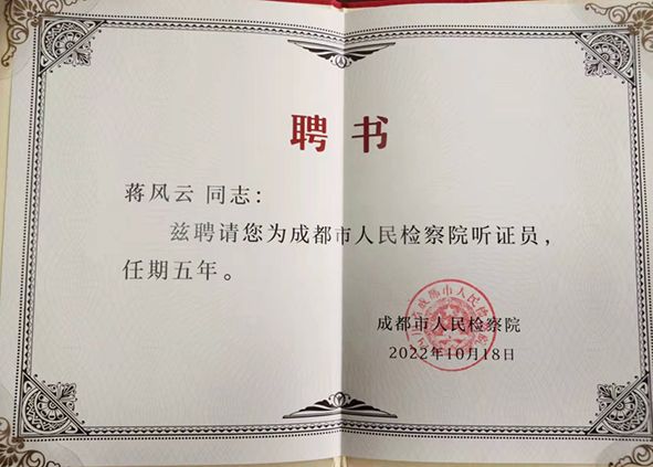 为推动检察听证工作全面深入开展,促进司法公开,保障司法公正,提升司法公信,近期,成都市检察院公布了2022年成都市检察院听证员名单。民进金堂县总支会员、四川诚峰律师事务所主任蒋风云受聘为成都市人民检察院听证员,任期五年。