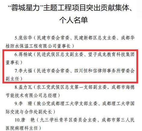 民进成都市委会常委、民进武侯区总支前主委、四川恒和信律师事务所管委会副主任李大福,民进武侯区总支副主委、望子成龙教育科技集团董事长蒋杨斌,荣获“‘蓉城星力’主题工程项目突出贡献个人”称号。