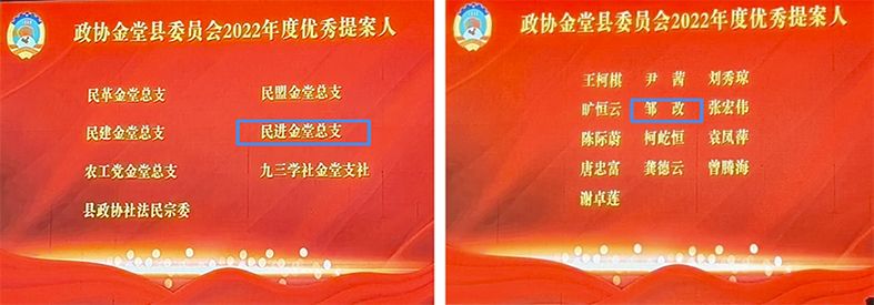 大会同时表彰了2022年度优秀提案、优秀提案人、优秀委员。金堂县总支提交的《关于打造亲水旅游目的地,作响“公园水城”特色品牌的建议》,会员邹改提交的《关于龙泉山城市森林公园建设为契机,促进金堂旅游产业发展的建议》被评为2022年度优秀提案;民进金堂总支、会员邹改被评为2022年度优秀提案人;总支副主委唐妮、支委委员蒋风云被评为2022年度优秀委员。