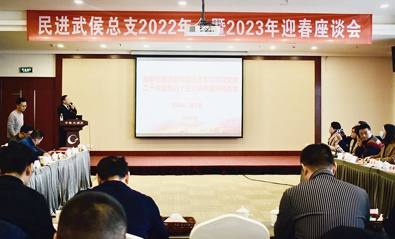 2023年1月7日,民进武侯区总支举行“凝心聚智建功新时代 履职尽责奋进新征程”的2022年会暨2023年迎春座谈会顺利召开。民进市委会副主委兼秘书长杜小丹、调研员宋祖斌,武侯区统战部常务副部长王睿、调研员段宝安,武侯区各民主党派代表等受邀出席。会议由民进武侯区总支秘书长王雷主持。