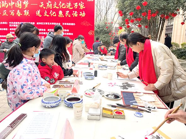 今年支部参加了由成华区委宣传部等单位牵头的“我们的中国梦——天府文化进万家”主题活动,率先在四川福宝美术馆拉开了活动序幕。11日上午,在主委徐宏的安排下,向运华偕民进之友张泽蓉、柳声扬、文强、陈薇等艺术家现场为群众书写春联300余副、绘画40余幅。