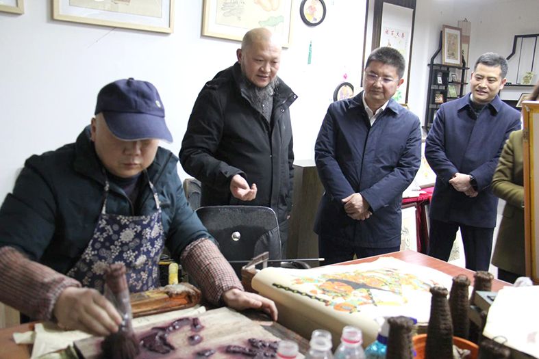 在夹江县“同心彩虹匠心传承”年画实践基地——夹江年画研究所,席代金仔细观看一张张生动活泼、充满情趣、寓意吉祥、制作精美的年画,对基地画师们高超的绘画技艺赞不绝口,鼓励他们创作更多更好的作品,奉献给广大人民群众和艺术爱好者。在听取基地负责人、民进夹江支部会员张荣强介绍基地建于2010年,研发团队中有省级非遗传承人2人,市级传承人5人,县级传承人10余人后,席代金嘱咐基地负责人,努力做好非物质文化遗产保护与传承工作,加强与省内外、国内外相关需求企事业单位和经销商对接,实现非物质文化遗产文化价值与经济效益的双赢。同时希望基地充分发挥汇聚人才、传承文化、带动群众的作用,不断提质增效,为推进全市“产业强市、旅游兴市”发展战略进一步凝心聚力。