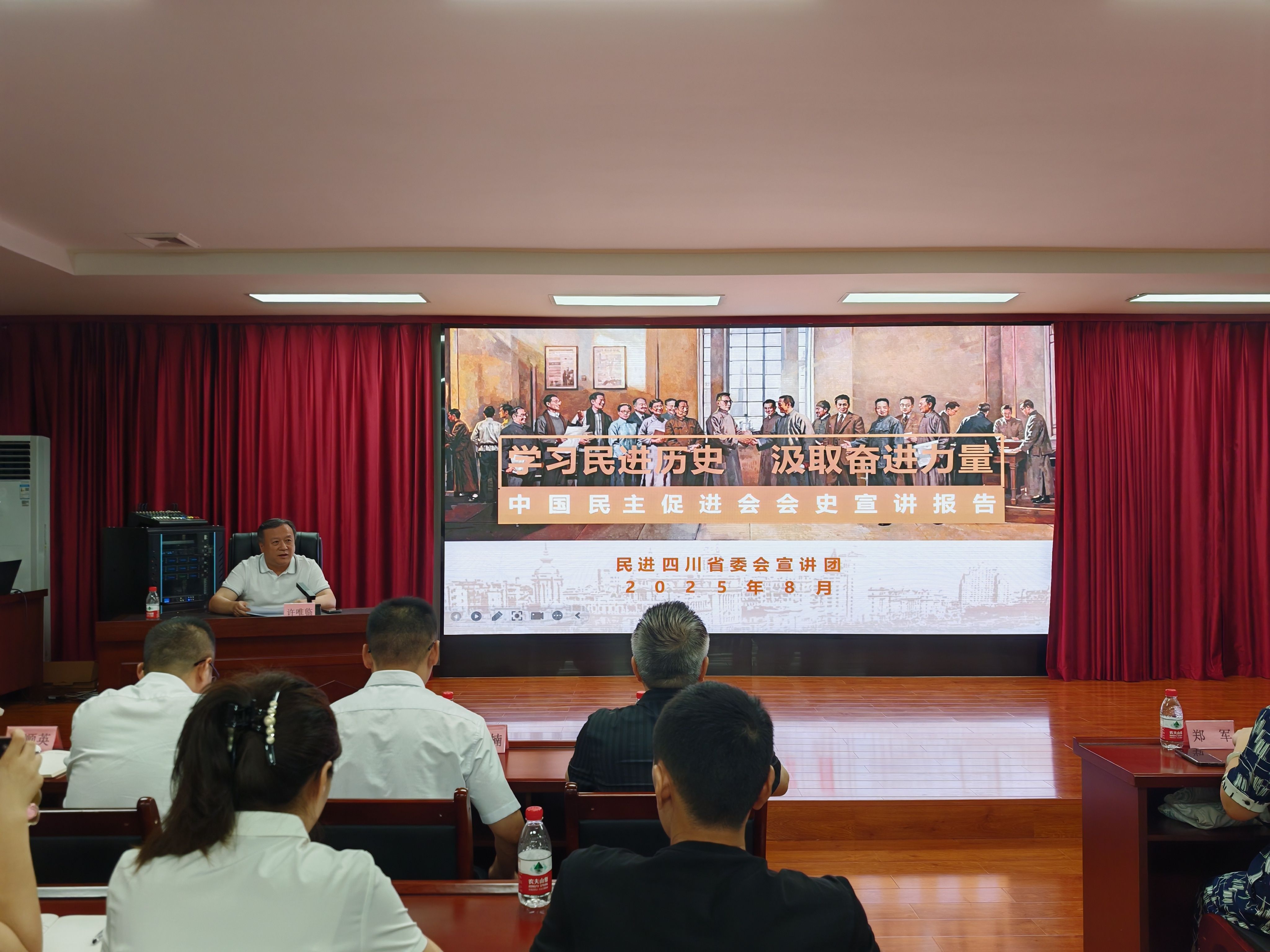8月28日,民进四川省委会赴绵阳开展“学习民进历史 汲取奋进力量”会史宣讲。民进四川省委会主委许唯临担任主讲人,民进四川省委会专职副主委向东、二级巡视员郑军出席宣讲会。会议由民进绵阳市委会副主委汪楠主持,市委会班子成员、各基层组织负责人、第41期新会员和骨干会员等60余人参会学习。