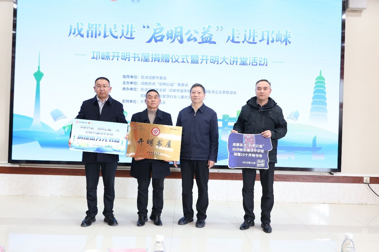 11月20日,成都民进“启明公益”将“开明阅读”之光带进邛崃市,向强项中学等6所学校捐赠了价值超过6万元的开明书屋、开明书包及作文教学专著,并邀请民进会员、全国中小学作文名师、苹果树下创始人伍苹为邛崃市各中小学老师授课。