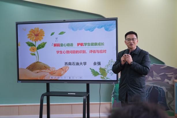 西南石油大学余强教授以“解码童心暗语 护航学生健康成长”为主题展开培训。培训从心理健康重要性、问题识别、应对方法等维度提升教师心理辅导能力,同时为2位教师、6名学生提供了一对一专业心理辅导。
