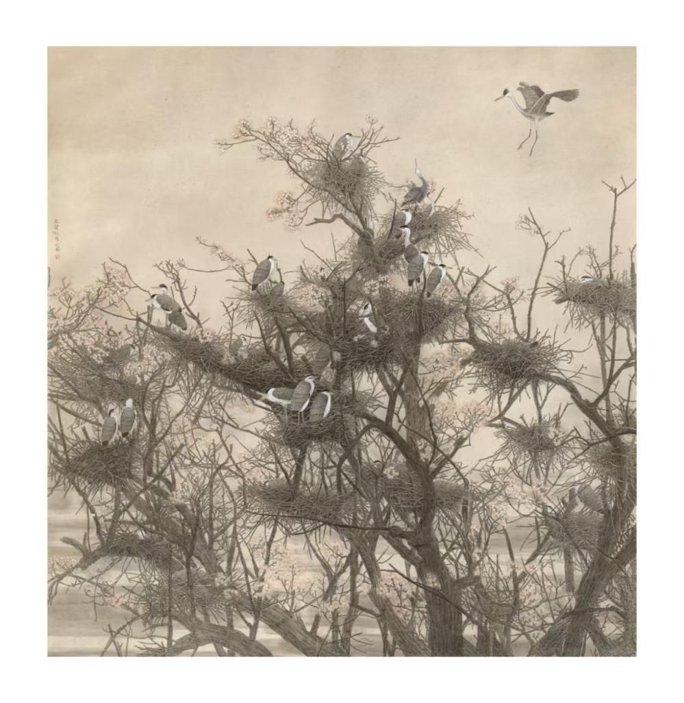《晨曲》创作于2023年,先后斩获首届川渝联展优秀奖,于2024年入选“乡风墨韵——全国中国画作品展”,充分展现了其艺术创作的持续突破与获得学术认可。该作品以嘉陵江畔灰鹭的生活场景为核心主题,通过细腻的笔触与意象化的表达,传递出人与自然和谐共生的生态理念。画面整体以黑白灰为色彩基调,追求淡雅质朴的艺术风格,既延续了中国传统水墨画“留白”“虚实相生”的美学精髓,又融入了对当代自然生态的观察与思考,形成独特的艺术语言。这种跨越传统与现代的创作实践,不仅体现了黄小兰扎实的绘画功底,更彰显了其以自然为载体、探索人文精神与生态价值的审美视角。
