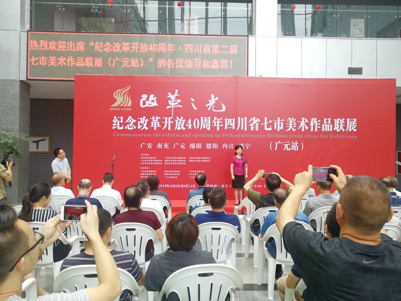 9月6日,纪念改革开放40周年四川省第二届七市美术作品联展走进广元,在市博物馆三楼展厅开展。民进四川省委副主委、广元市主委、市人大常委会副主任赵爱武出席开幕式并宣布开幕。 本次展览汇集南充、广安、广元、绵阳、德阳、内江、遂宁七市画界精英的精品力作140件。展出的书画作品形式多样,涵盖国画、油画、水彩等门类,这些作品立意新颖、形式多样、主题突出、特色鲜明,都是围绕改革开放这个主题最新创作的作品。民进昭化支部会员陆占培创作的中国画《云台山外山》,作品通过对云台山雄奇秀美的描绘,表达了对祖国改革开放以来取得的巨大成就由衷的赞美!
