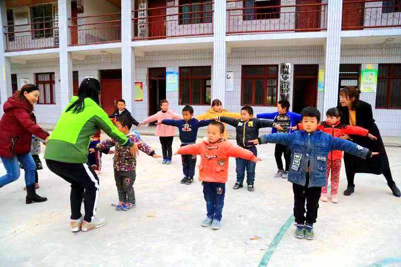 音乐教师卢晓玲和体育教师赵燕送教荣山镇宋坪村教学点,她们教孩子们唱儿歌、做游戏、练韵律操、学广播操等。