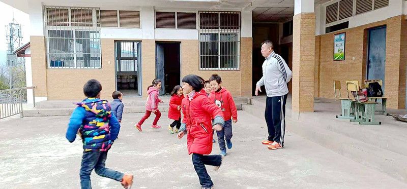 体育教师周跃送教荣山镇高旗村和花园村两个教学点,他与孩子们一起庄严升国旗,站队列、做游戏等。