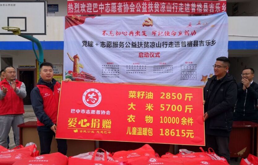 据悉,此次捐赠活动由巴中市志愿者协会、巴中市电视台新闻365、中国邮政集团公司巴中市分公司主办。共捐赠社会各界爱心企业、爱心人士捐赠的菜籽油2850斤、大米5700斤、衣物10000件、儿童温暖包18615元。