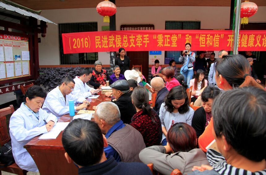 5月15日,民进武侯总支为继续践行“同心思想”,牵手医疗机构“秉正堂”和“恒和信”律师事务所来到民进成都市委会对口扶贫点——都江堰市大观镇宿仙村,为当地群众开展健康义诊与法律咨询公益活动。