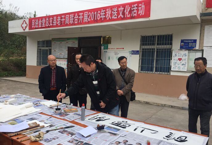 11月8日,民进金堂总支联合县教育局、县老干局到金堂县高板镇开展送教.送文化活动。本次活动由总支副主委曾国强带队,共有来自民进金堂总支、县教育局、县老干局、县志愿者服务队的名优教师、书画名家30余人参加。
