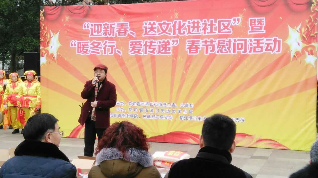 1月20日上午,民进成都市委书画院、民进都江堰支部、都江堰市美协的书画家们与都江堰市灌口街道党工委、办事处;灌口街道太平社区“迎新春,送文化进社区”暨“暖冬行、爱传递”春节慰问活动及民进成都市委书画院春联进万家活动,在都江堰幸福路节点广场举行,都江堰市人大常委、民进成都市委书画院院长、民进都江堰支部副主委、都江堰市美术家协会主席廖鹏、都江堰市灌口街道太平社区党总支书记唐俊、都江堰市政协委员、民进成都市委书画院副院长、都江堰市美协秘书长余有志等向太平社区贫困家庭发放了慰问品,书画家现场书写春联300余幅,受到群众热烈欢迎。