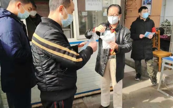 裴润庭老人捐赠口罩和手套时很多人问要多少钱?老人挥挥手说:不收钱!不收钱!