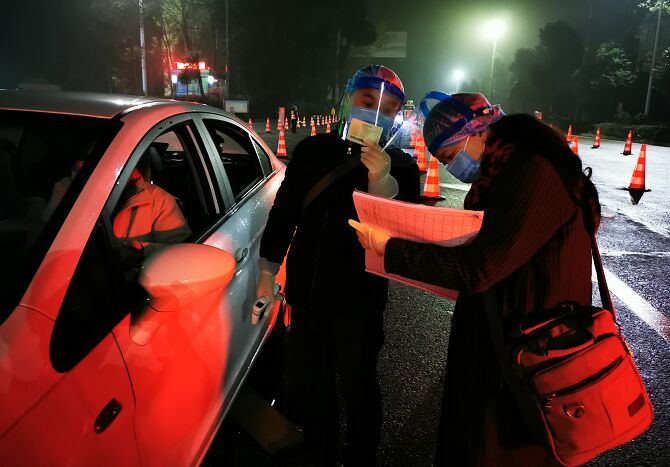 金堂是成都的“东大门”,每天有大量的车辆途经金堂到达成都,是外地输入感染源的最危险通道。为把好关口,截断病源,金堂县在成南高速淮口服务区设置防控检测点,对过往车辆进行排查,因为对此项工作难度预估不足,临检之初通道和参与人员严重短缺,很快便堵起了万米长龙。