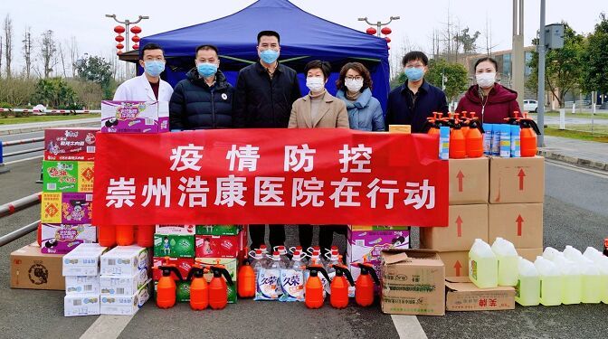 崇州浩康医院全体员工个人为表达对抗“疫”一线人员的关爱。2月11日,在短短的一天之内,全院就捐款共计6905元,用于购买防控物资。于2月18日向崇州市元通镇执勤点捐赠口罩400个,牛奶6件。2月19日向崇州市卫生执法大队捐赠口罩400个。向崇州市老年人协会捐赠防新冠肺炎中药包100包,共计8000余元。
