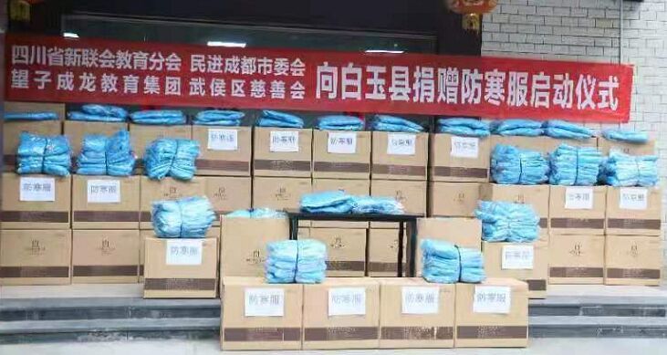 12月28日,四川省新联会教育分会、民进成都市委会、望子成龙教育集团、武侯区慈善会向白玉县贫困学生捐赠防寒服启动仪式在成都市蛟龙工业港双流园区举行。中共四川省委统战部新阶处副处长赵怡、干部余梦超,民进成都市委社会服务处处长夏冬梅,武侯区民政局副局长,武侯区慈善会执行副会长张德才,望子成龙教育集团董事长蒋杨斌出席了此次捐赠仪式。