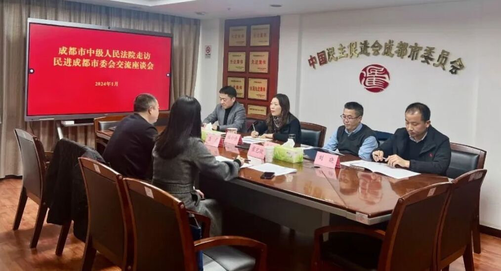 2024年1月9日,成都市中级人民法院党组成员、副院长龚成,民三庭法官助理崔艺捷走访民进成都市委会交流座谈。民进成都市委会副主委兼秘书长杜小丹,民进成都市委常委、民进武侯区总支前主委、恒和信管委会副主任李大福,民进成都市委会宣传处副处长刘晓、民进成都社会法治工作委员会副主任、民进武侯区总支秘书长、北京市惠诚(成都)律师事务所管委会副主任王雷参加座谈。