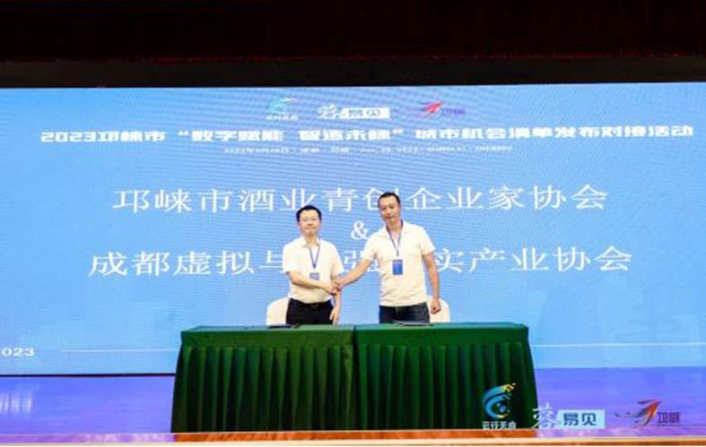 6月28日,邛崃市举办了以"数字赋能 智造未崃"为主题的城市机会清单发布对接活动。邛崃市支部会员王鼎代表邛崃市酒业青创企业家协会与成都虚拟与增强现实产业协会签署《探索酒业虚拟与增强现实技术应用战略合作协议》。这一协议的达成标志着两家协会将在酒业领域的虚拟与增强现实技术应用方向展开深度合作,为推动区域经济发展和产业升级开启了新的篇章。