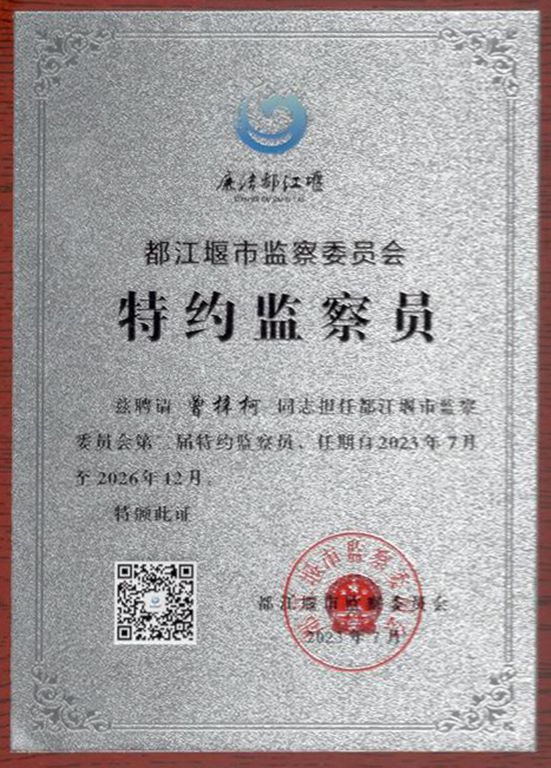 成都都江堰支部会员曾梓柯被聘为都江堰市监察委员会特约监察员