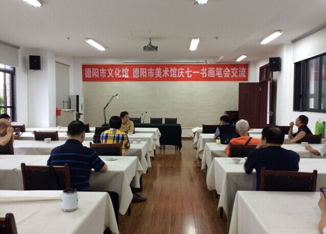 6月29日,德阳市文化馆,德阳市美术馆召开庆七一书画笔会交流活动,德阳民进书画院刘代明、谢颖、王远闻、周厚江、刘朝晖等书画家应邀参加了这次笔会交流活动。