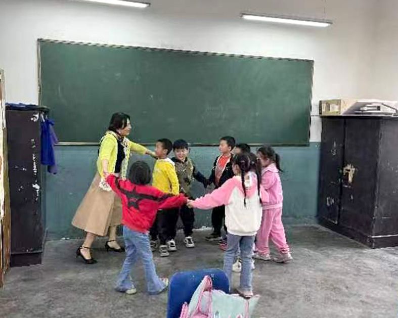 “大手和小手交朋友”,黄莉同该校一年级的8名留守学生进行了形式多样的互动活动,把这里变为孩子们欢乐的海洋,幸福的宫殿。为表达对民进会员到来的热烈的欢迎,小女生班长还作了非常正式和隆重的欢迎辞。黄莉同每个小朋友一一握手,鼓励大家积极的自我介绍。四个女孩子一起合唱了“小燕子”儿歌;8个孩子与她一起转圈圈,大家忘我的载歌载舞,快乐无比……