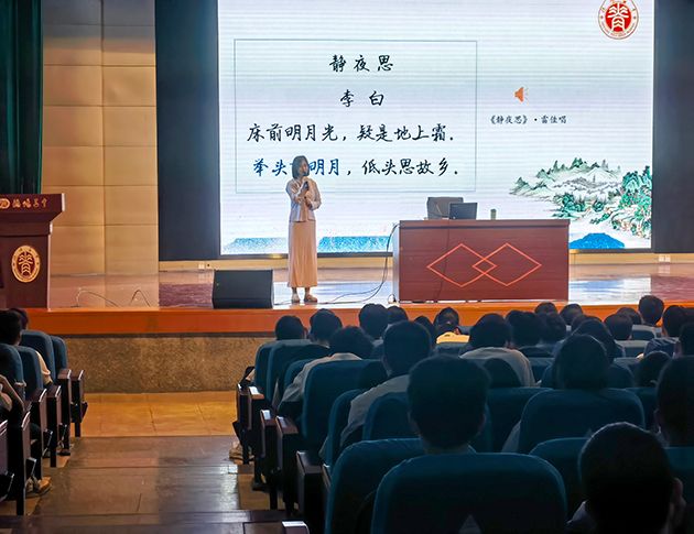 讲座现场,王娟老师以《静夜思》的朗读、唱歌、吟诵三个版本的对比,让现场师生感知吟诵的音韵魅力。继而,通过讲解吟诵入门的三个方法带领孩子们声情并茂、抑扬顿挫的吟诵诗文,千年流传的文化古韵,为会场增添了浓厚的文化气息。