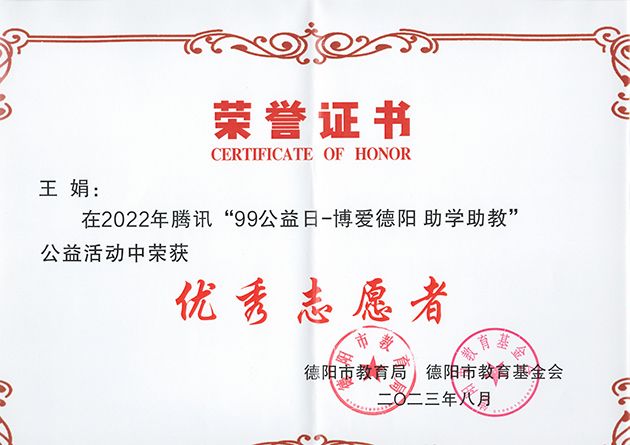8月25日,德阳市教育局召开“2022年‘99公益日--博爱德阳 助学助教’总结会暨2023年工作培训会”。 会上,民进德阳市城南支部会员王娟荣获德阳市“优秀志愿者”荣誉称号。
