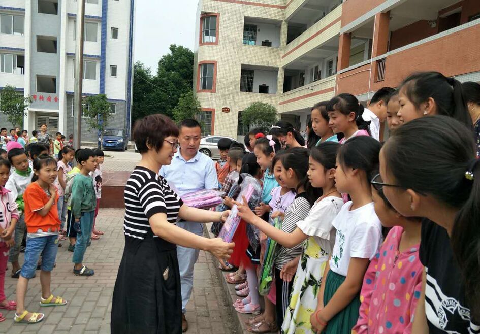民进广安支部副主委黎红为孩子们发放书包、文具