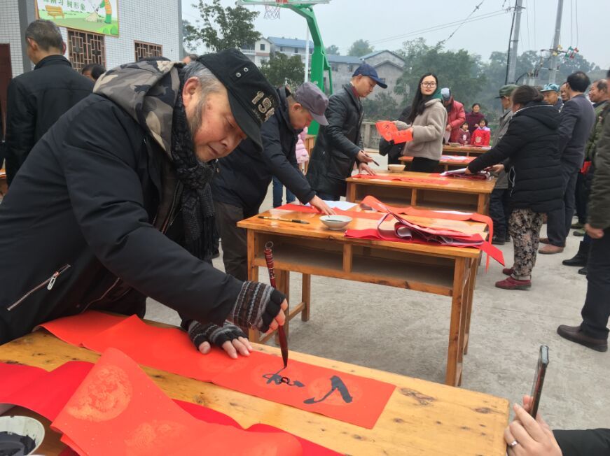 一大早,十多位书画家在民进四川省委副主委赵川荣的带领下,来到小寨村村委会,近百位村民早已等候于此。“欢迎,欢迎!乡亲们都盼着你们来呐!”村书记田发才紧紧握住赵川荣副主委的双手。“都是老朋友了,年年都会来的!走亲戚嘛,今年也不例外。”赵副主委笑呵呵地说。