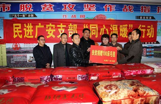 二是开展“广安民进同心.温暖”行动。给华蓥贫困群众送去100床毛毯,让其温暖过冬;给武胜县叶家奄小学贫困家庭学生送书包50多个、送图书1000多册、送文体用品100多件;开展“朗诵进校园.文化下基层”大型文化扶贫演出6场次,其中2场全程网络直播,点击率高,受众达20多万人。发动会员和亲朋好友购买剑阁县、凉山州、安龙县等地近10万元的扶贫产品,以购代捐。