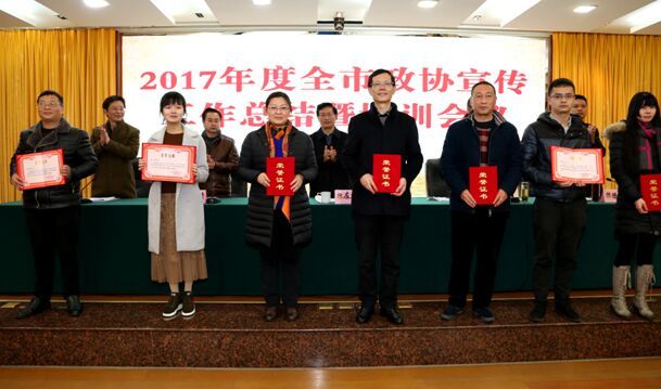 1月25日,乐山市政协在井研县召开2017年度全市政协宣传工作直接暨培训会议。市政协副主席左文良、秘书长李刚、研究室主任冯柏清,各区县政协分管副主席、各民主党派市委、工商联秘书长以及具体从事信息宣传工作人员、获奖人员等参加了会议。会议对通过无记名投票评选出的21位“2017年度政协系统好新闻作品”获奖人员进行了表彰,其中民进乐山市委副调研员兼办公室主任陈鸿的《原生态 新生代 夹江年画展现新力量》和民进乐山市委委员、沙湾区总支主委李云清的《“小手牵大手”向垃圾说“拜拜”——乐山市沙湾区政协委员王萍容和她的“环保小卫士”们》两篇作品分别获得三等奖。