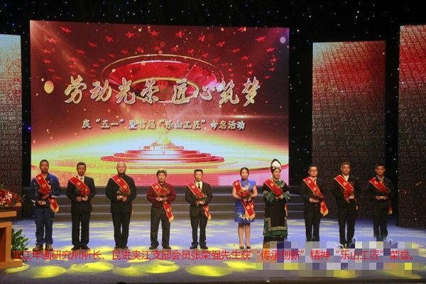 4月26日下午,乐山市庆“五一”暨首届“乐山工匠”命名活动在中心城区大佛剧院举行。市委副书记、市长张彤出席活动并讲话。省总工会二级巡视员陈黎,市委副书记、市总工会主席田文,市人大常委会副主任袁加乐,市政协副主席易志隆出席活动。夹江年画研究所所长、民进乐山夹江县支部会员张荣强先生在活动中荣获“传承创新”精神“乐山工匠”荣誉。