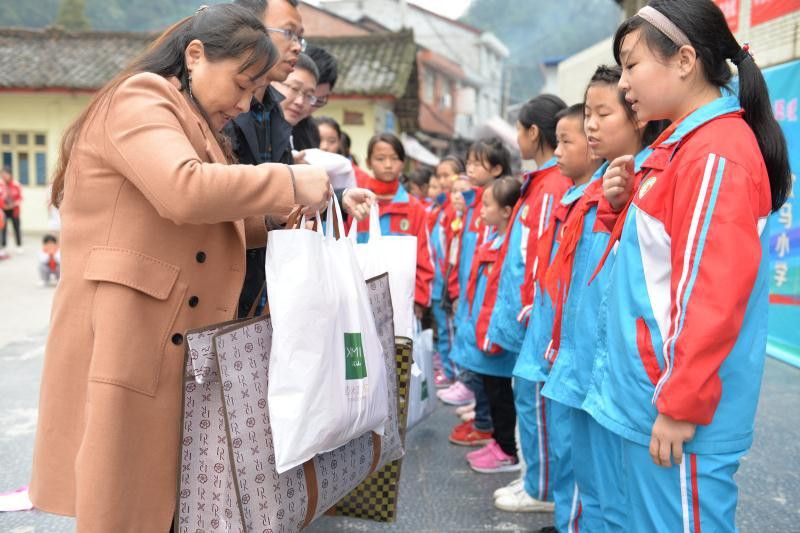 (中共夹江县委统战部副部长、民宗局长李碧辉向贫困学生发放暖冬物资)