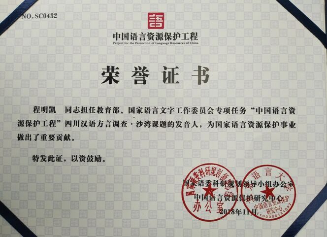 9月29日,会员程明凯收到国家语委科研规划领导小组办公室、北京语言大学中国语言资源保护研究中心邮寄来的“中国语言资源保护工程发音人”证书,民进乐山市沙湾区总支向他表示祝贺!