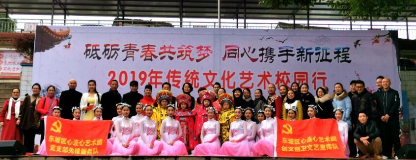 为贯彻落实党的十九届四中全会精神,弘扬中华优秀传统文化,让更多师生领略传统文化艺术的魅力。11月20日,由民进眉山市委,东坡区文广旅局主办,民进东坡区总支、东坡区心连心艺术团、东坡区戏剧家协会、东坡区文化馆联合承办的:“砥砺青春共筑梦,同心携手新征程”2019年传统文化艺术校园行系列活动在东坡区金花初中隆重举行!