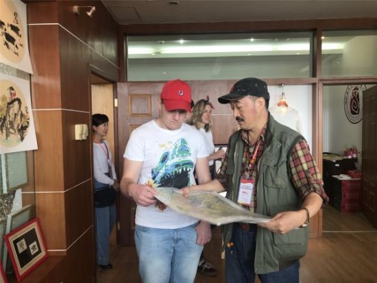 活动现场,一名来自巴基斯坦的留学生拿出自己的一幅作品,找到非遗传承项目葫芦雕绘的传承人谢咏言,与其探讨交流,并让谢咏言给出了建议。另外一名留学生则拿着现场展示的一个印有熊猫的展示品,用简单的中文说着:“我喜欢熊猫,非常非常漂亮!”