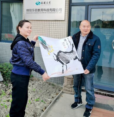 在听取乐萌教育集团负责人赵秀茹介绍“蒙氏”教育从心里智力引导到培养良好习惯的方式后,杨盛向乐萌教育集团赠送国画《为民服务孺子》,他说:幼儿教育关乎祖国的花朵是否鲜艳可爱,乐萌教育担负娃娃们茁壮成长的担子任重道远,一定要牢记习总书记新春讲话精神,要干做为民服务孺子牛,要像一支燃烧的蜡烛照亮童心。