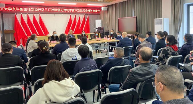 11月5日,绵阳市人大常委会副主任,民进市委主委李京平赴联系社区经开区三江社区召开学习贯彻市第八次党代会精神座谈会。市委外办主任方敏,市政协社法台侨民宗委主任向莉、副主任寇化松,经开区党工委副书记谢文伟,民进市委秘书长赵波及社区党员代表50余人参加座谈。