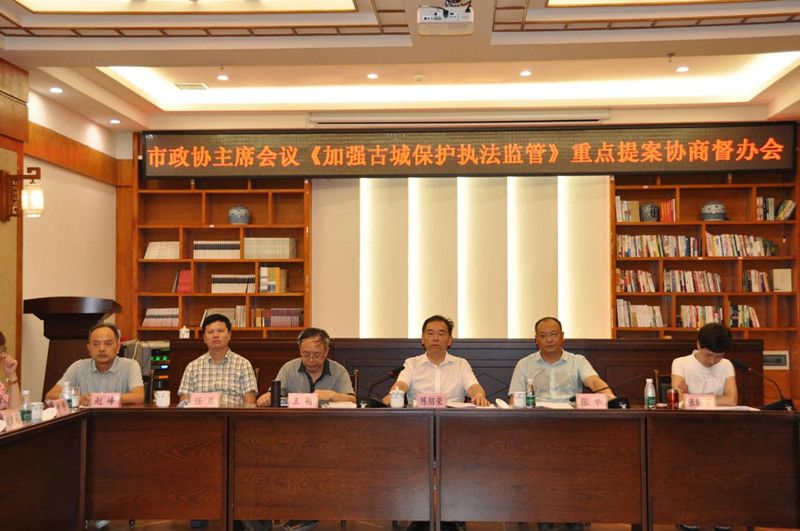 现场调研结束后,随即召开了“《加强古城保护执法监管》重点提案协商督办会”。会上,阆中古城景区管理局副局长宋海全从“把提案办理作为重中之重,把直面问题作为根本要求,将传承保护作为始终遵循”三个方面通报了提案办理情况,并就提案中“关于拆除古城核心区、控制区不协调建筑;组建古城保护督察大队”等6个问题一一作出回应。市住建局、市公安局、消防大队等协办单位,分别就涉及职能相关问题进行了补充说明和建议。民进阆中总支部主委袁勇对市政协领导高度重视提案工作、亲力亲为抓提案落实表示感谢,对提案承办方的面商沟通、书面答复和实际取得的成效表示满意,并就“拆除不协调建筑经费保障、古城消防、古城保护立法执法等任然存在的问题提出了意见建议。张明甫等5位与会委员也从门票收入公开、古城保护与经营并重、加强职能部门沟通联系等方面对提案进行了陈述。参会的其他政协领导及委员也分别表达了对阆中古城保护的期望和建议。张华副市长对重点提案给与了高度评价,就提案办理工作作了强调,对古城保护当前系列工作予以明确。他说,市委市府将进一步加强政治协商,重视政协的调研成果,努力为建设“世界古城旅游目的地”凝聚力量。
