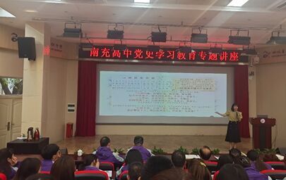 中共南充高中党委于4月28日下午在顺庆校区学术厅举行“南充高中党史学习教育专题讲座”。会议由学校党委副书记王尚明主持,张思德干部学院汪瑶老师作题为《红歌赏析话初心》的专题讲座,党委书记、校长涂刚为全体党员上主题党课。民进南充高中支部部分会员参加了这次活动。