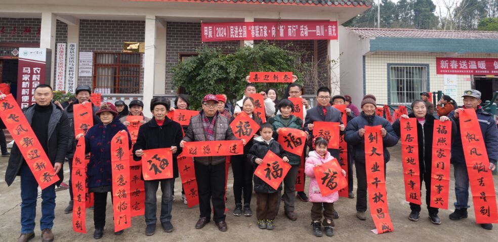 为弘扬中华民族优秀传统文化,推动文艺赋能乡村振兴,营造欢乐喜庆的节日氛围,1月27日,民进南充市委会组织南充开明画院3名书法家到蓬安县金溪镇马家桥村开展“甲辰(2024)民进全国‘春联万家?向新而行’”活动,为村民现场写春联,书“福”字,送上民进人新年的问候和祝福。