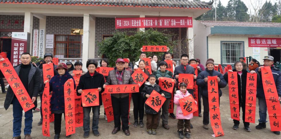 为弘扬中华民族优秀传统文化,推动文艺赋能乡村振兴,营造欢乐喜庆的节日氛围,1月27日,民进南充市委会组织南充开明画院3名书法家到蓬安县金溪镇马家桥村开展“甲辰(2024)民进全国‘春联万家?向新而行’”活动,为村民现场写春联,书“福”字,送上民进人新年的问候和祝福。