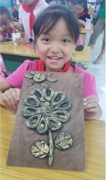熊英老师首先为孩子们讲解了什么是黏土铜版画及其特点,然后现场演示了如何使用超轻黏土制作一条栩栩如生的铜版鱼。在各位会员的细心指导下,孩子们兴致勃勃地玩弄着手中的一块块黏土,反复雕琢。活动过程中,很多人在制作自己作品的同时,不忘帮助身边遇到困难的小朋友,大家互帮互助,最终都做出了自己喜欢的作品,脸上洋溢着开心自豪的笑容。孩子们表示,要把作品挂到家里或送给长辈,祝他们健康长寿。