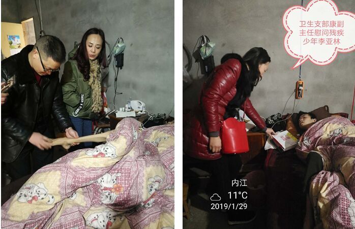 新年刚到,李亚宁就因重症肌无力病情恶化,卧病在家,时常反复,1月29日,卫生支部一行,还连同龚家镇卫生院同志一起,到李亚宁家里看望慰问这两个苦命孩子,为他们带去年货和书籍,鼓励李亚宁和病魔做斗争,过一个平安年。没想到这一别竟成永诀。