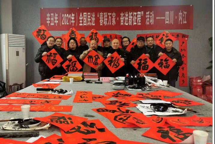 2021年1月29日,民进内江市委会开明画院开展辛丑(2021)年民进全国“春联万家 奋进新征程”活动,按照疫情防控要求,减少人员聚集,开明画院书画家们在市政协书画院书满怀激情地书写了150余副春联和200多个“福”字,并录制新年祝福小视频。
