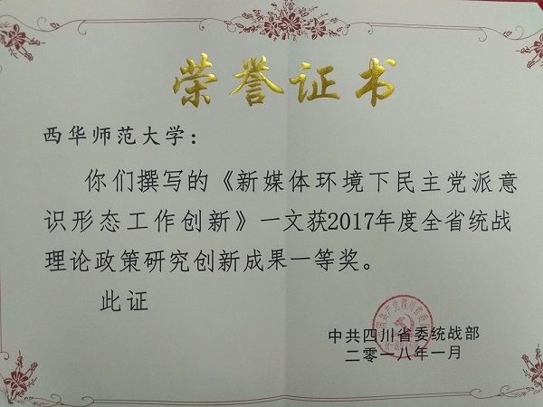 近日,民进西华师范大学基层委员会副主委、西华师大行政与政治学院副院长黄祖军撰写的《新媒体环境下民主党派意识形态工作创新》一文获2017年度全省统战理论政策研究创新成果一等奖。