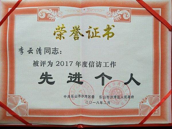 在全区信访工作会中,沙湾民进会员李云清被中共乐山市沙湾区委、乐山市沙湾区人民政府评为2017年度信访工作先进个人。